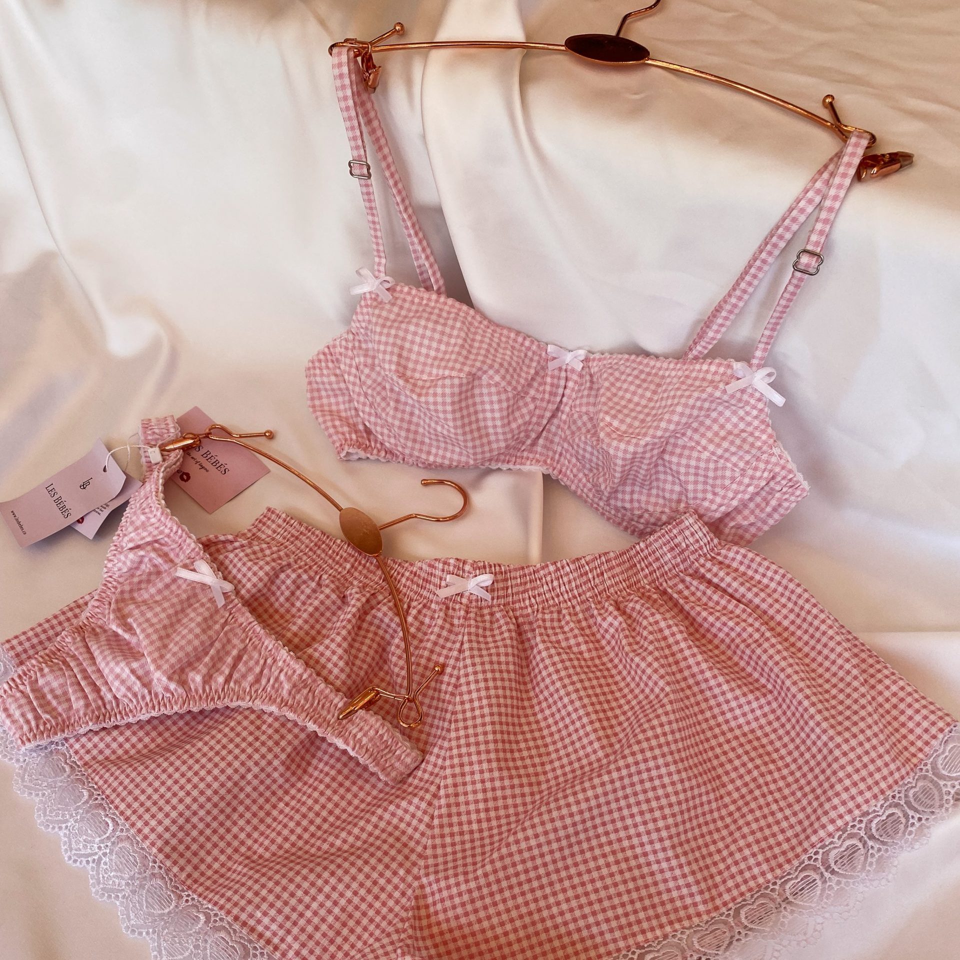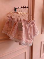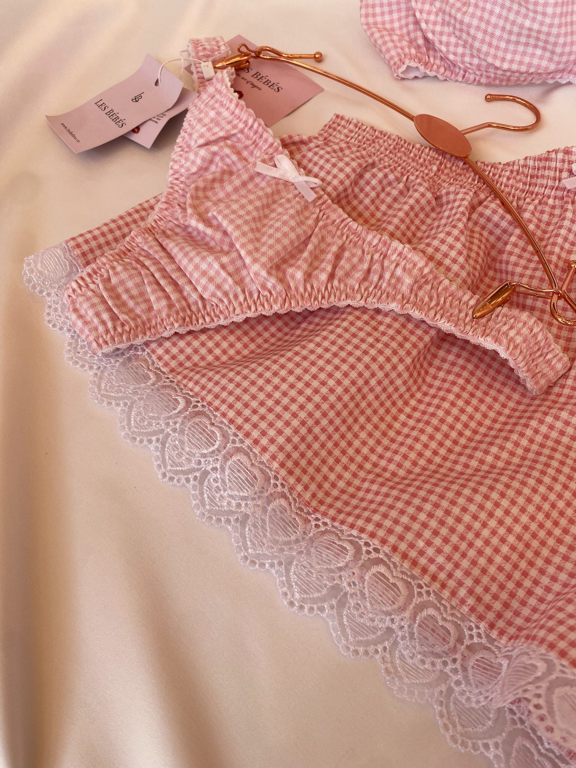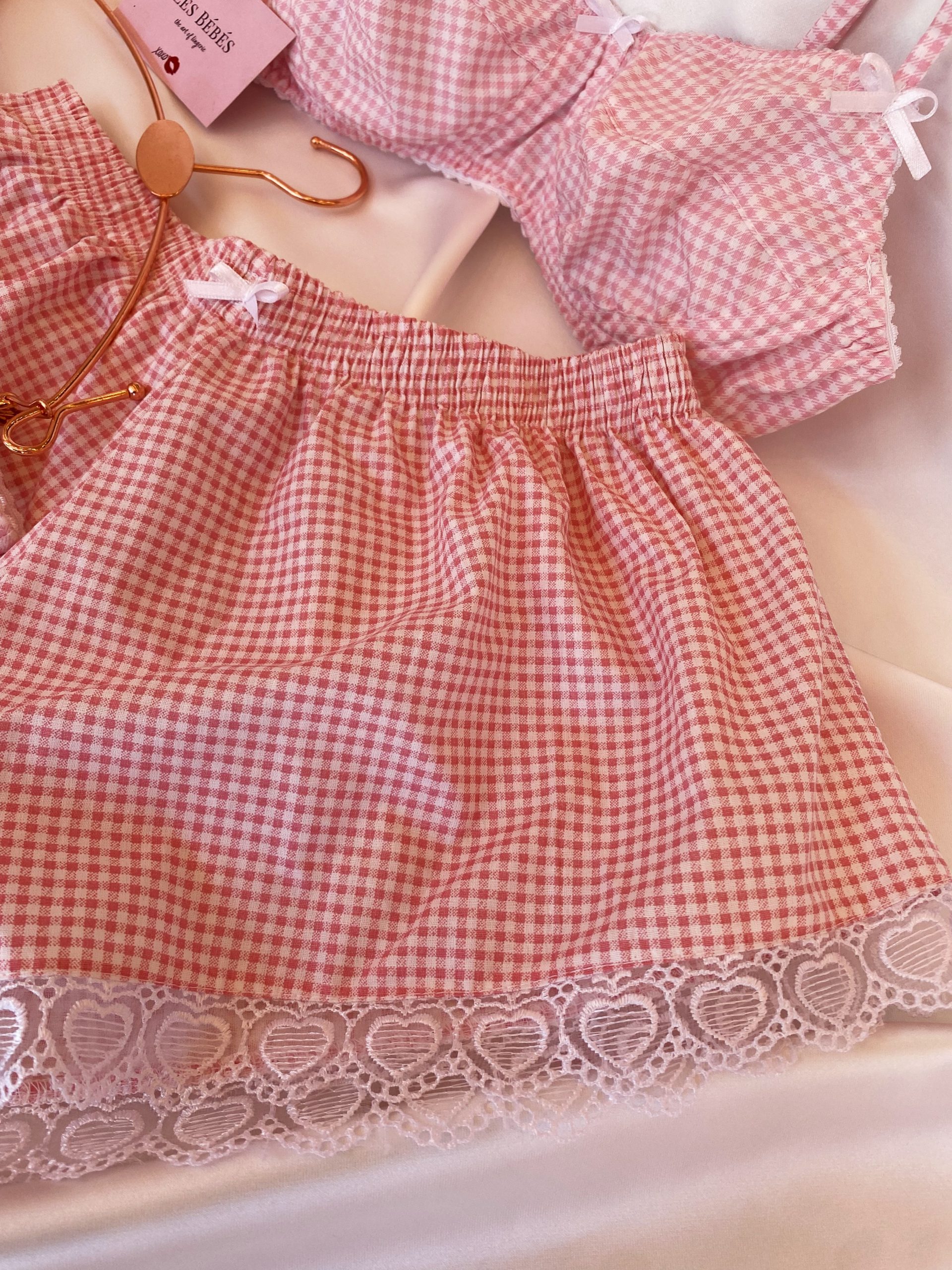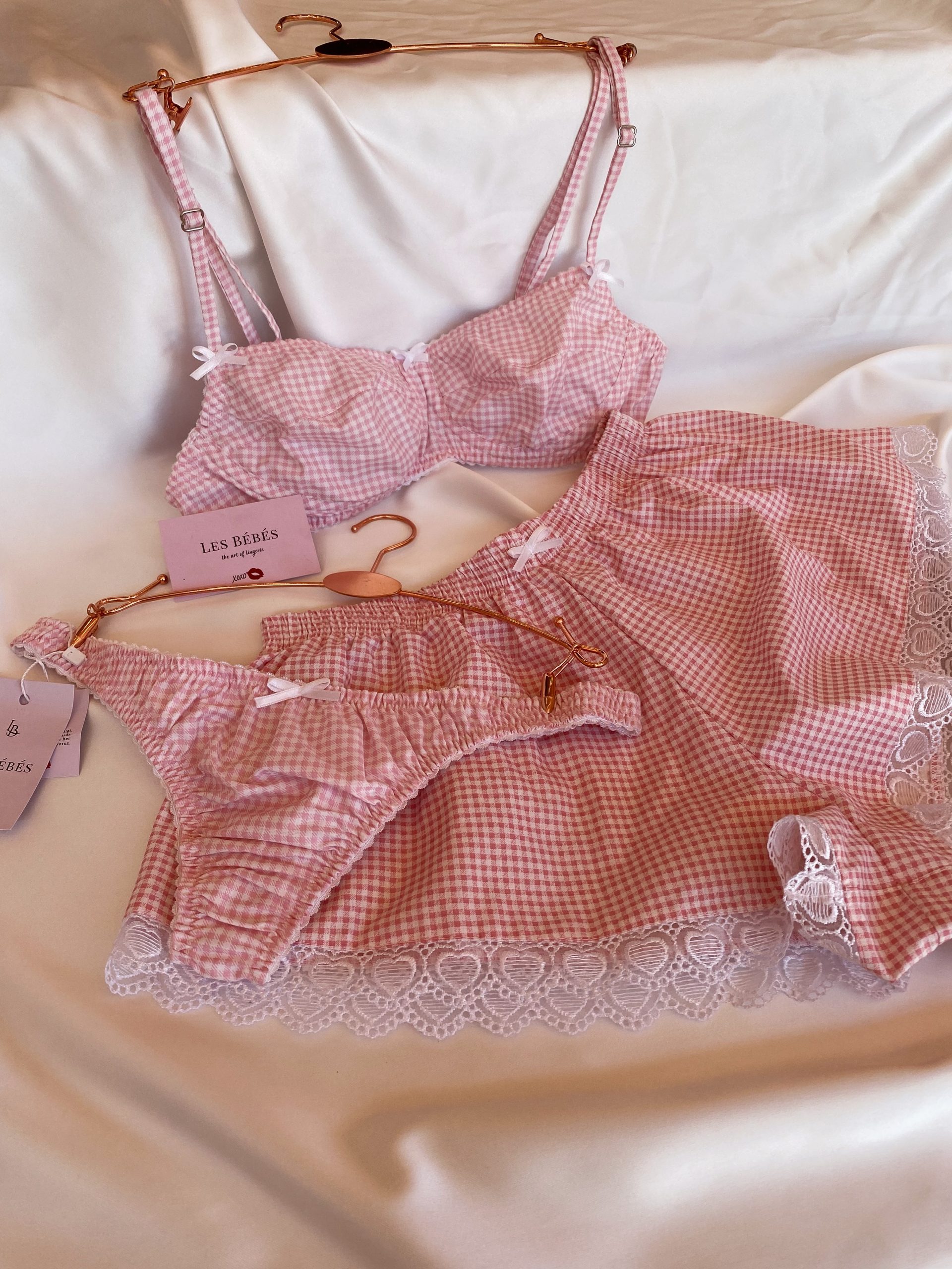 Özel tasarım pamuklu kumaşı ile balenli sütyen, tanga ve şort takımı.
