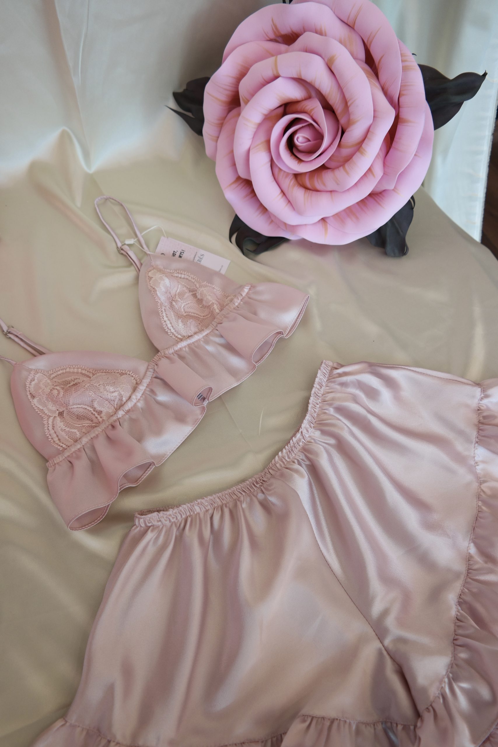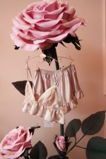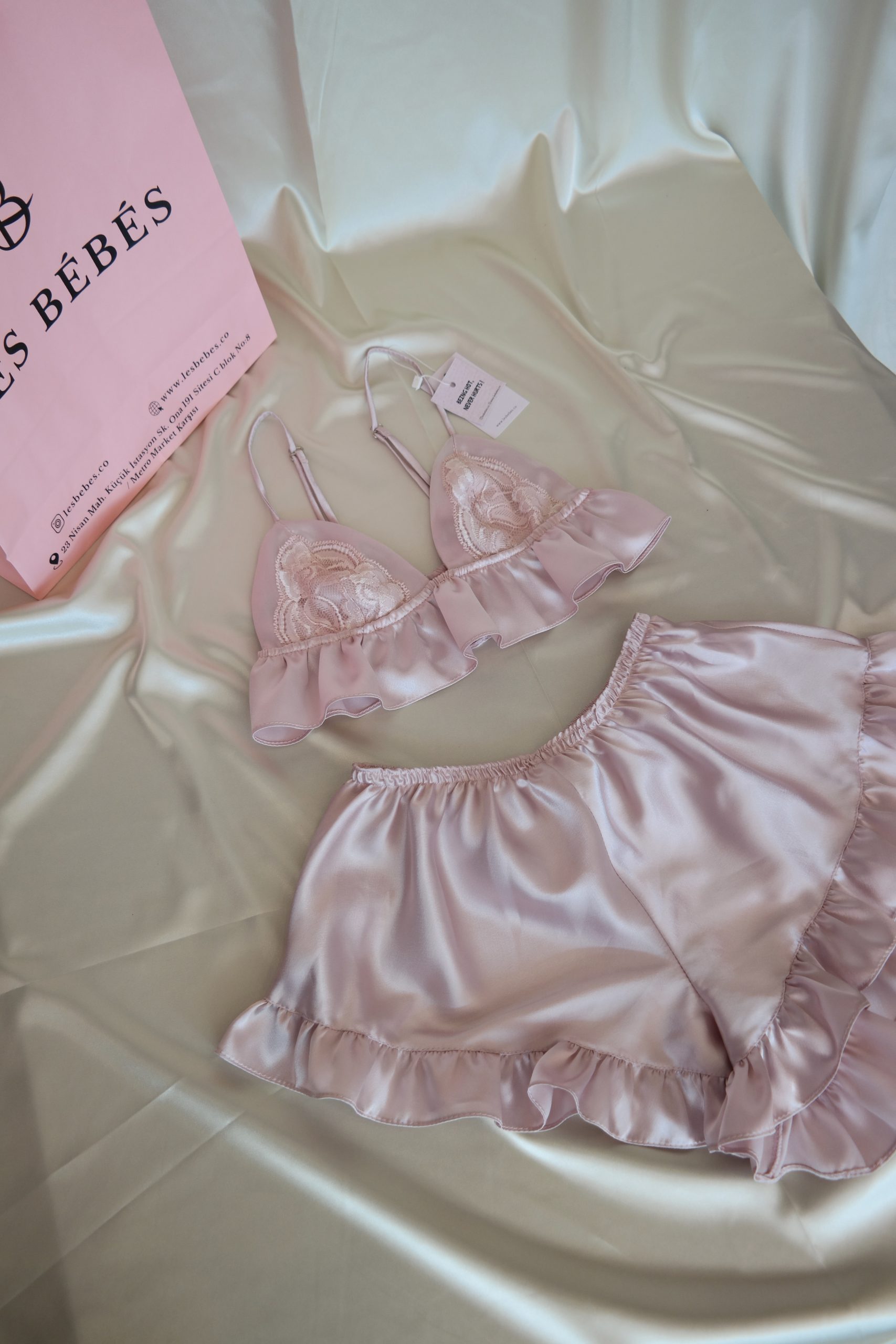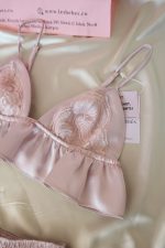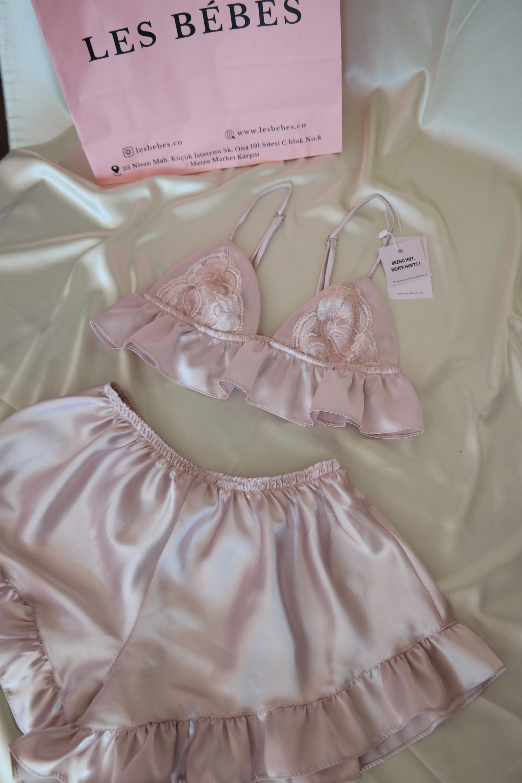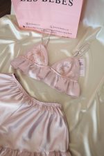 Özel tasarım, saten, dantel detaylı bralet ve fırfırlı pijama takımı. Oversize kesimi ile şıklığı ve rahatlığı bir arada yaşayın.